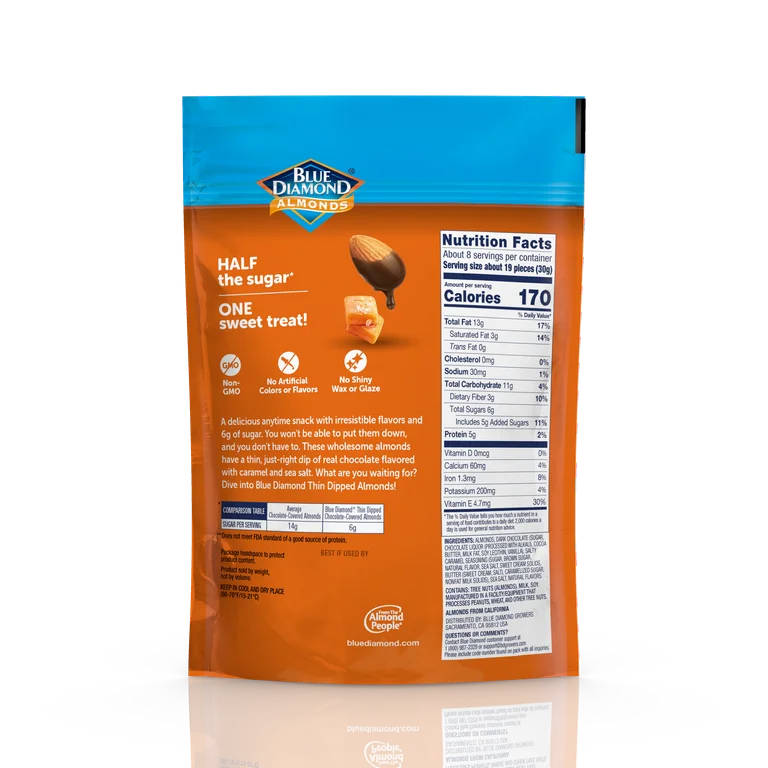 Disfruta de la exquisita combinación de Almendras Cubiertas Blue Diamond con Chocolate Oscuro y Caramelo de Sal Marina. Este delicioso producto de 227g es perfecto para satisfacer tus antojos de una manera indulgente y saludable.